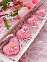 Kruche różowe pralinki z lśniącą skorupką, kryjące w sobie aksamitny mus z białej czekolady i odrobiną poziomkowego nektaru.