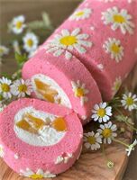 Biszkoptowa rolada z nadzieniem śmietankowym z owocami brzoskwini.