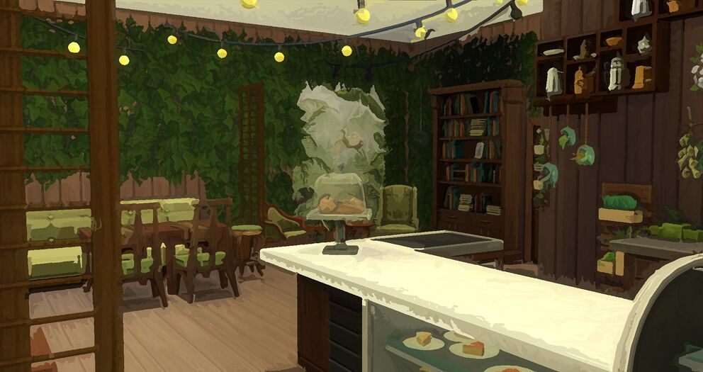 Do dyspozycji gości są 2 stoliki z dwoma miejscami oraz 1 z pięcioma (krzesła/ława/stołek w zależności od stolika), a także dwa różne fotele w dalszej części pomieszczenia, niedaleko biblioteczki z książkami, które można czytać na miejscu. Na biblioteczce przytwierdzona jest karteczka z prośbą o nieniszczenie zbioru. Między stolikami i fotelami na wystylizowanej na pień drewna szafce leżą poduszki w różnych rozmiarach i kolorach - w razie gdyby siedzenia były zbyt niskie dla gości, ci mogą z nich skorzystać.