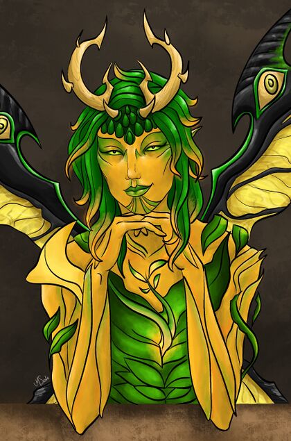 Emiye to dość wysoki sylvari (182 cm), o szczupłej budowie ciała. Wnikliwe oko może zauważyć, że sylvari ten ma względnie wąskie ramiona, a także biodra nieco szersze od przeciętnego przedstawiciela płci męskiej. Ponadto ma również delikatne dłonie i zgrabne nogi. Jego skóra ma gładką, liściastą strukturę w kolorze miąższu mango. Twarz sylvara ma dość łagodne rysy, podkreślone zielonymi zakończeniami liści. Oczy Emiye mają kolor jasnej, agresywnej zieleni oraz koci kształt, dający wrażenie mocnego makijażu. Uwagę mogą zwrócić również wydane, zielone usta oraz lekko garbaty i dość płaski nos z dwoma sterczącymi listkami u nasady. Nieco ponad czołem sylvara wyrastają cztery drewniane rogi – dwa malutkie z przodu oraz dwa duże i zawinięte do tyłu, upstrzone kilkoma ostrymi zakończeniami. Fryzurę sylvara stanowią drobne listki układające się w łuski przy mniejszej parze rogów oraz długie zielone liście, sięgające do ramion. Nocą Emiye świeci mocnym pomarańczowym światłem. | Emiye to dość wysoki sylvari (182 cm), o szczupłej budowie ciała. Wnikliwe oko może zauważyć, że sylvari ten ma względnie wąskie ramiona, a także biodra nieco szersze od przeciętnego przedstawiciela płci męskiej. Ponadto ma również delikatne dłonie i zgrabne nogi. Jego skóra ma gładką, liściastą strukturę w kolorze miąższu mango. Twarz sylvara ma dość łagodne rysy, podkreślone zielonymi zakończeniami liści. Oczy Emiye mają kolor jasnej, agresywnej zieleni oraz koci kształt, dający wrażenie mocnego makijażu. Uwagę mogą zwrócić również wydane, zielone usta oraz lekko garbaty i dość płaski nos z dwoma sterczącymi listkami u nasady. Nieco ponad czołem sylvara wyrastają cztery drewniane rogi – dwa malutkie z przodu oraz dwa duże i zawinięte do tyłu, upstrzone kilkoma ostrymi zakończeniami. Fryzurę sylvara stanowią drobne listki układające się w łuski przy mniejszej parze rogów oraz długie zielone liście, sięgające do ramion. Nocą Emiye świeci mocnym pomarańczowym światłem. | ||